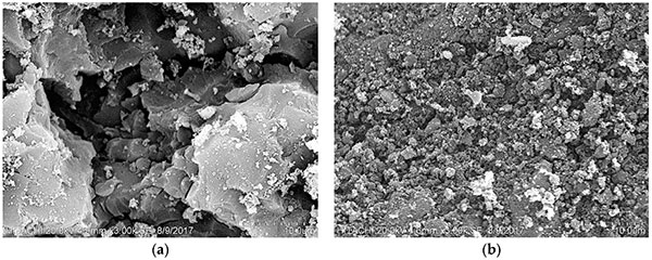 圖1:在3000×放大倍數(shù)下的SEM照片:(a)未經(jīng)預處理的活性炭,(b)微波處理的活性炭。