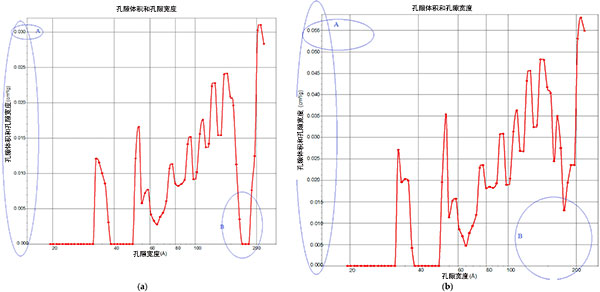 圖2.:(a)未經(jīng)預處理的活性炭(b)微波處理的活性炭增加孔體積與孔寬度的關(guān)系。