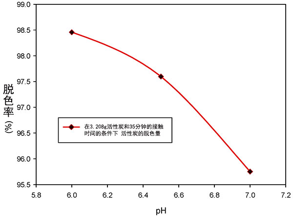 實驗過程中發(fā)現(xiàn),活性炭在較低的pH環(huán)境對顏色吸附效果得到大幅度增強。盡管如此,排放處理的酸性廢水的影響可能直接阻礙水生棲息地。鑒于此,使用預處理的活性炭吸附研究在6至7的可接受的pH范圍內(nèi)進行?紤]的另外兩個因素是劑量和接觸時間,并且它們分別保持在3.208g和35min。從圖3中可以看出可以觀察到,顏色去除的百分比隨著pH的降低而增加。在pH6時獲得最高的顏色去除率98.46%,但隨著pH增加到7,顏色去除率降低到95.69%。