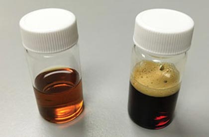 圖4.左小瓶經(jīng)過活性炭過濾。右小瓶未經(jīng)過活性炭其中的泡沫穩(wěn)定長(zhǎng)達(dá)4小時(shí)。