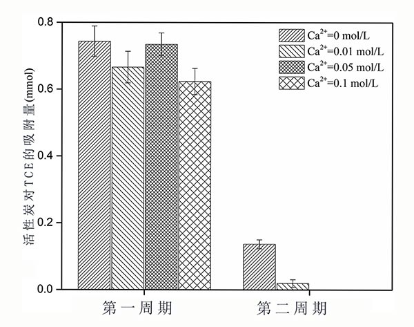 如圖2所示,進行了兩次吸附/再生循環(huán)。在第一次吸附/再生循環(huán)期間,當(dāng)鈣離子存在時,TCE去除明顯減少。顯然,在第二次吸附/再生循環(huán)期間,即使進行活性炭的再生,也難以在鈣離子條件下除去TCE。這表明鈣離子不僅在活性炭的吸附能力,而且在其再生過程中都起著重要作用。原因可能是由于鈣離子與其他離子的結(jié)合,導(dǎo)致其容易在活性炭表面上沉淀并影響其吸附能力,導(dǎo)致第二循環(huán)中TCE去除的減少。