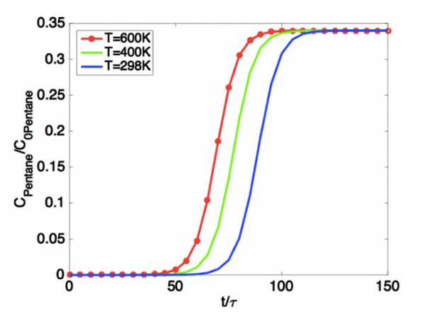 結(jié)果與討論我們已經(jīng)提出了一個(gè)綜合模型,該模型定量地預(yù)測(cè)了填充床反應(yīng)器中油蒸氣回收的吸附動(dòng)力學(xué)。在該模型中,我們僅考慮軸向擴(kuò)散,并使用質(zhì)量守恒方程來(lái)模擬油氣吸附的時(shí)空分布。我們假設(shè)活性炭吸附在恒溫下操作,并且與活性炭的吸附容量相比,油蒸氣濃度非常低。此外,假設(shè)油蒸氣中的組分之間不發(fā)生化學(xué)反應(yīng),因此每種組分可以作為獨(dú)立的吸附物處理。因此,多組分吸附問(wèn)題可以轉(zhuǎn)化為單組分吸附問(wèn)題。下圖(圖2)說(shuō)明了吸附動(dòng)力學(xué)的溫度依賴(lài)性。