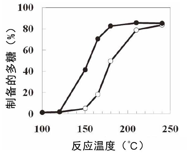 將含有或不含活性炭的葡萄糖漿在各種溫度下加熱30分鐘(圖2)。從100℃至120℃,觀察到多糖難消化部分的含量幾乎沒有增加。含有和不含活性炭的多糖難消化部分的含量在150℃下為41.4%和4.9%。在120至180℃下,在活性炭存在下不可消化部分的含量顯著增加。在高于180℃的溫度下,難消化部分的產(chǎn)生是恒定的。因此,當(dāng)加熱溫度高時,可以在短時間內(nèi)達到目標(biāo)產(chǎn)率。在設(shè)計制造過程時,反應(yīng)溫度和時間的平衡很重要。
