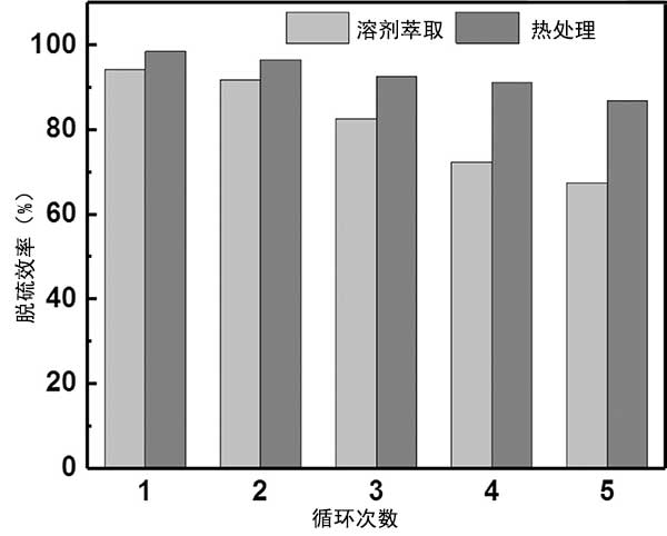 在吸附脫硫中使用的各種方法中,溶劑萃取和熱處理被認為是常用的再生方法。在這項實驗中,溶劑萃取和熱處理都用于研究活性炭的再生性能。關(guān)于溶劑萃取方法,在第一次吸附循環(huán)完成后,通過外部磁體收集活性炭,并通過添加甲醇作為萃取溶劑進行洗滌。然后,將活性炭干燥用于下一次運行。如在示出的圖3,它被發(fā)現(xiàn)的活性炭可在前兩次運行時通過溶劑洗滌輕松再生。這可能是因為物理吸附在吸附過程中占主導(dǎo)地位,并且由污染引起的大多數(shù)失活吸附劑可以通過溶劑萃取方法在初始循環(huán)中再生。然而,在連續(xù)五次再生操作后,吸附劑與新鮮吸附劑保持67%的初始脫硫效率(相當于20.22mg DBT/g)。隨著循環(huán)次數(shù)的增加,活性更高的位點與DBT相互作用,并且后一次運行留下的活性位點更少,從而導(dǎo)致隨后的再生運行中脫硫效率降低。為了提高活性炭吸附劑的再生效果,引入了熱處理方法。通過溶劑萃取再生后,將獲得的活性炭在氮氣氛下在350℃下活化1小時來恢復(fù)活性。