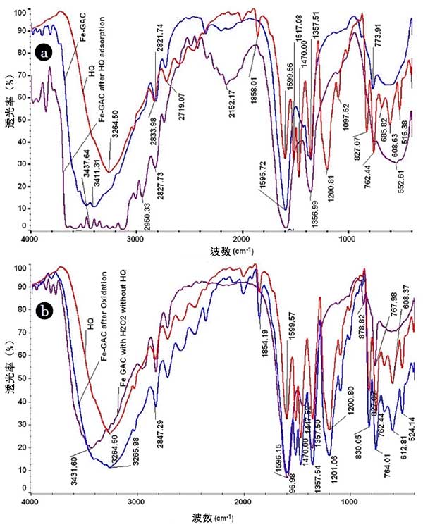 圖1:(a)苯二酚的FTIR,鐵浸漬活性炭之前和苯二酚吸附后,(b)氫醌活性炭的氧化后。