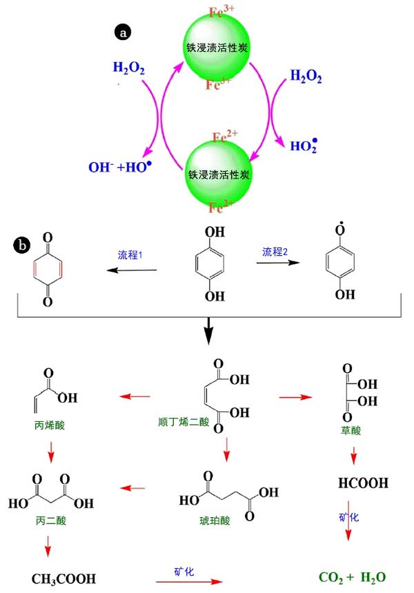各種類(lèi)型如羥基(HO•)和過(guò)氧羥基(HOO•)自由基的從而起到在苯二酚的氧化重要作用是由各種鐵化合價(jià)的氧化-還原反應(yīng)生成的鐵(Fe(III)/Fe的(II))存在于的鐵浸漬活性炭催化劑在過(guò)氧化氫的存在下進(jìn)行。氧化反應(yīng)得到由形成絡(luò)合物開(kāi)始Fe(III)的-OH基團(tuán)。代在表示這些基團(tuán)的機(jī)制圖2(a)中。這些自由基氧化苯二酚(ⅰ)吸附在催化劑,(ⅱ)存在于催化劑的附近和(iii)在本體溶液中。的苯二酚氧化機(jī)理示于圖2(b)中。苯二酚在其氧化形式各種中間體取決于氧化的階段。它形成的中間體,在此期間被氧化成羧酸,如馬來(lái)酸,草酸,丙烯酸,琥珀酸,丙二酸,乙酸和氧化的后面酸氧化的初期階段,例如苯醌和CO 2和H 2 O的充分氧化。