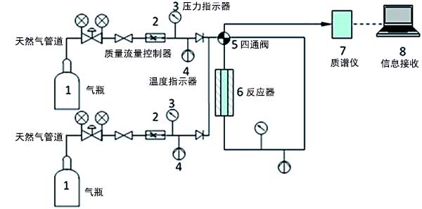 在我們之前的工作中開(kāi)發(fā)了吸附裝置來(lái)測(cè)量氣體穿透曲線(圖1)。它由三個(gè)主要部分組成:準(zhǔn)備部分、吸附段和分析部分。在氣體制備部分中,吹掃氣體是高純度Ar氣體(99.999%),其用于在引入烴氣體之前通過(guò)惰性氣體管線和反應(yīng)器吹掃系統(tǒng)。吸附部分使用丙烷或乙烷在氦氣或人造氣體混合物,其通過(guò)燃料氣體管線和反應(yīng)器。這兩條線都碰到了一個(gè)四端口交叉閥。整個(gè)裝置等溫(~26℃)。閥門位置,氣體流量,壓力和溫度完全自動(dòng)化,并由內(nèi)部程序控制。通過(guò)質(zhì)譜儀分析和量化來(lái)自反應(yīng)器出口的氣體。