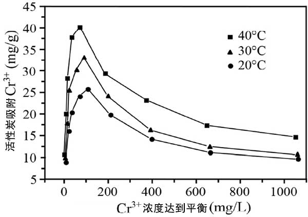 2、已經(jīng)確定,活性炭在20、30和40℃下的鉻吸附等溫線具有取決于平衡濃度的不規(guī)則形狀。三條曲線顯示出類似的趨勢,陽離子攝取量的初始增加非常快。達(dá)到最大值后,隨著平衡溶液中鞣劑含量的增加,它們明顯降低。