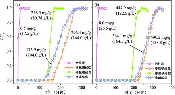 活性炭對甲苯的穿透曲線以及吸附容量如圖2所示。沒摻氮的活性炭表現(xiàn)出較差的甲苯吸附性能,吸附容量分別為6.5和8.0mg g-1。與摻氮活性炭相比,添加含氮磷酸鹽的活性炭需要更長的時間才能接近突破并表現(xiàn)出更高的吸附能力。對于在600℃下制備的活性炭,其經(jīng)含氮磷酸鹽處理的活性炭的突破時間為氨磷酸鹽活性炭>磷酸脲活性炭>聚磷酸銨活性炭,其相應(yīng)的體積吸附容量為144.0,104.0和89.8g L-1,質(zhì)量吸附容量分別為296.4,175.9和245.8 mg g-1,分別。與600℃相比,900℃制備的活性炭具有更高的甲苯吸收量,體積吸附容量為122.5-164.5g L -1,質(zhì)量吸附容量為364.1~496.2 mg g-1。值得注意的是,可以看出氨磷酸鹽處理的活性炭具有較高的質(zhì)量吸附能力,而磷酸脲處理的活性炭具有較高的體積吸附能力。這可能歸因于它們不同的堆積密度,氨磷酸鹽具有比磷酸脲更高的堆積密度。