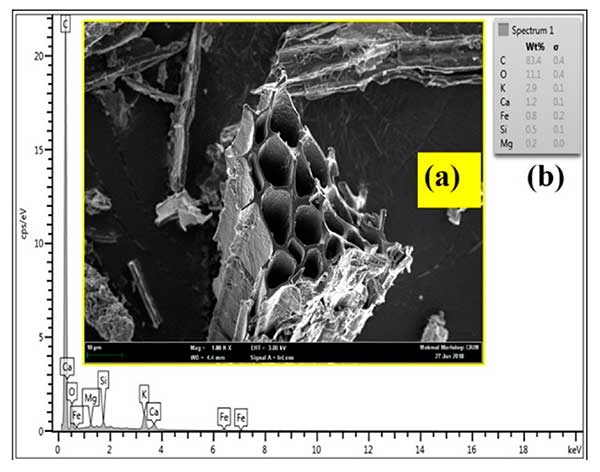 FESEM和EDX如圖2所示。FESEM用于研究活性炭的表面形態(tài)。孔徑分布與孔隙大小具有相同的附屬關(guān)系,如圖2a,b所示。在顯微照片圖像中指出,圓柱狀管構(gòu)成所制備的活性炭的孔結(jié)構(gòu)。由黃麻和椰子纖維制成的活性炭反映了同樣的趨勢(shì)。此外,揭示了通過(guò)活化劑能在纖維表面上具有良好構(gòu)建和發(fā)展孔隙與高表面積。