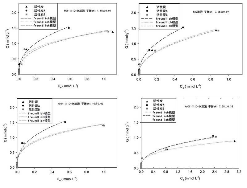 從圖3可以看出,在所有測試的實驗條件下,當平衡濃度較低(即<0.1mmol L-1)時,對羥基苯甲酸甲酯吸附量的差異三種活性炭最小,而對于較高的平衡濃度,活性炭A表現(xiàn)出最高的性能,活性炭和活性炭B具有相似的行為,除非離子強度發(fā)生變化。事實上,在后一種情況下,熱處理樣品顯示出最佳性能并且?guī)缀跸嗨啤榱嗽敿毞治鰴z索到的結(jié)果,需要進一步調(diào)查,建模分析可能會有所幫助。