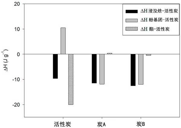 為了確定酯基在吸附質(zhì)-吸附劑相互作用中的貢獻,從對羥基苯甲酸甲酯-活性炭和苯酚-活性炭的相互作用焓開始計算相互作用的焓酯-活性炭。對于該計算,假設(shè)焓是分子的加成組成性質(zhì),因此對羥基苯甲酸甲酯-活性炭的相互作用焓對應于苯酚和酯與活性炭相互作用焓的總和。圖4中顯示了對羥基苯甲酸甲酯-活性炭,苯酚-活性炭和酯基團在水中吸附物-吸附劑的相互作用中的貢獻。