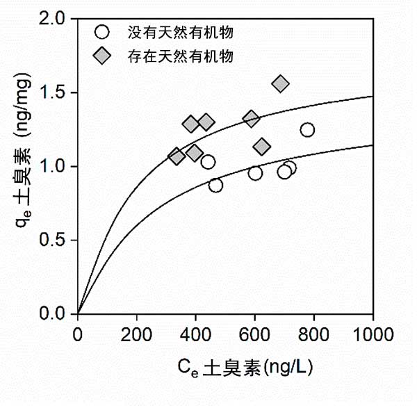 吸附平衡實(shí)驗(yàn)進(jìn)行60分鐘,這足以根據(jù)動(dòng)力學(xué)研究達(dá)到吸附平衡。圖3顯示了在不存在和存在天然有機(jī)物質(zhì)的情況下土臭素在活性炭上的吸附等溫線。如圖2所示,在天然有機(jī)物質(zhì)存在下,吸附的土臭素的總量增加。這些結(jié)果意味著天然有機(jī)物質(zhì)可以增加活性炭的吸附位點(diǎn)。帶負(fù)電荷的天然有機(jī)物質(zhì)增加,因?yàn)殡娕懦饬Γ瑥亩黾恿嘶钚蕴课侥芰Α?/p>