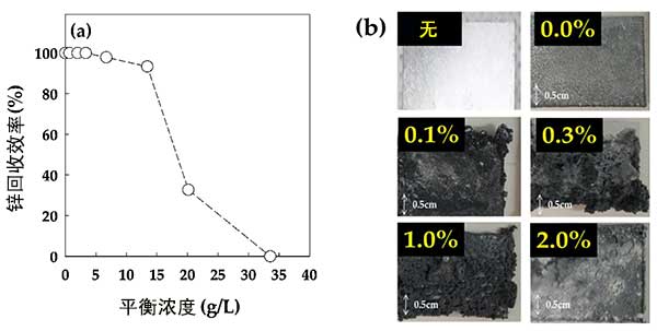 如圖4所示,在吸附物濃度為0.00-0.50%存在下的鋅回收效率至少恢復(fù)99.9%。在超過(guò)0.50%的吸附物存在下,鋅回收效率趨于迅速降低。一個(gè)電極的表面由具有不同吸附內(nèi)容物的電解質(zhì)中回收,在沒(méi)有吸附物的情況下,電極表面顯示出均勻的沉積。然而,對(duì)于0.1-2%的吸附物,電極表面看起來(lái)非常不均勻地生長(zhǎng)。向電解質(zhì)中添加有機(jī)物改變了金屬沉積物的特征。從顯微鏡分析中,向電解質(zhì)中添加有機(jī)物導(dǎo)致在沉積表面上形成孔。因此,吸附物的存在降低了鋅的回收效率并導(dǎo)致不均勻的沉積。因此,去除吸附物必須小于0.1%。