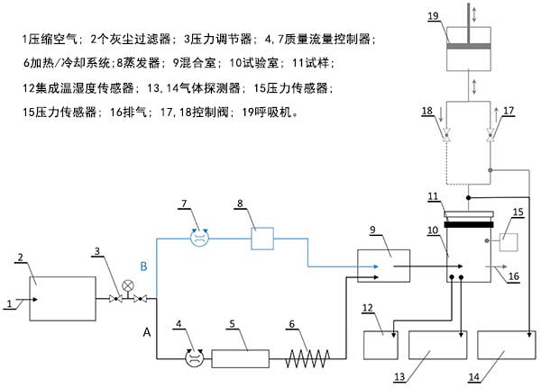 使用環(huán)己烷蒸氣作為被吸附物質(zhì)在圖2中所示的試驗(yàn)臺(tái)上進(jìn)行突破性實(shí)驗(yàn)。選擇環(huán)己烷進(jìn)行實(shí)驗(yàn),因?yàn)樗菧y(cè)試標(biāo)準(zhǔn)中特性比較全面的。此外,測(cè)試設(shè)置如圖2所示由于這種情況,優(yōu)化了使用環(huán)己烷作為測(cè)試物質(zhì)。環(huán)己烷是這類物質(zhì)的良好代表,因?yàn)樗欠菢O性和非反應(yīng)性的,因此應(yīng)主要通過物理吸附與活性炭表面結(jié)合。此外,它是在工業(yè)過程中大量使用的化合物之一,因此它經(jīng)常存在于工作環(huán)境中。