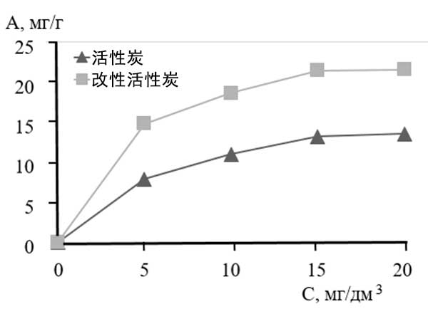 用發(fā)煙硫酸處理活性炭導(dǎo)致磺酸鹽基團(tuán)捕獲吸附劑表面和孔內(nèi)部。用二氯乙烷對活性炭的初級處理有利于磺化劑在孔深度中的滲透,從而增強氧化,并由此促進(jìn)磺酸鹽基團(tuán)的形成?咨疃戎谢撬猁}基團(tuán)的存在增加了吸附劑相對于汞離子的吸附能力。對于改性活性炭在靜態(tài)條件下對汞離子吸附的研究結(jié)果,根據(jù)獲得的實驗數(shù)據(jù),繪制了活性炭和改性活性炭的比較等溫線(圖1)。