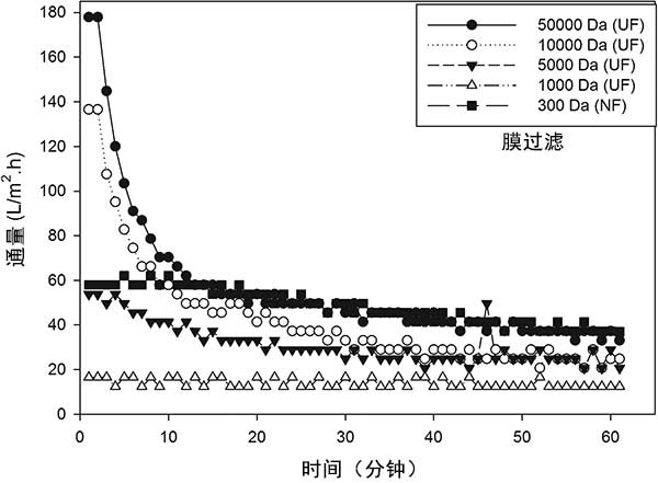 在膜過濾測試中,使用四個(gè)UF膜和一個(gè)NF膜。研究了1小時(shí)的通量變化,并監(jiān)測了降低的通量。在UF膜觀察到較高的通量降低。過濾1小時(shí)后,隨著截留分子量從50,000 Da減少到1,000 Da,通量下降也減少了。對于10,000 Da UF膜,在初始通量1小時(shí)過濾后損失了82%的通量。1,000 Da UF膜顯示出較低的通量在圖2顯示?讖绞怯绊懩み^濾通量的最重要參數(shù)之一,也是影響活性炭吸附能力的參數(shù)。通量也受膜結(jié)構(gòu),水中成分和廢水pH的影響。有些膜有很高的同量主要是由于膜表面與廢水成分之間的靜電相互作用。