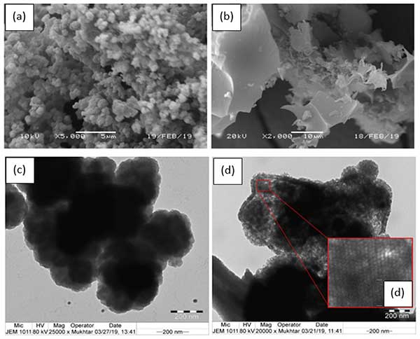 使用SEM,TEM,TGA和XRD分析活性炭的表面形態(tài),熱性質(zhì)和結(jié)晶度。用作活性炭前體的圖像(圖1a,c)顯示其典型的形態(tài)為花椰菜樣結(jié)構(gòu),這種形態(tài)似乎是由于與其中摻雜地嵌入無序聚合鏈形成的。然而,聚吡咯的球形結(jié)構(gòu)通過碳化過程被破壞,導(dǎo)致粗糙,粗糙的表面由不規(guī)則的尖角和剝離狀顆粒組成,在SEM圖像中幾乎沒有孔隙的跡象;钚蕴烤圻量┑腡EM圖像如圖1d所示表示觀察到均勻分布的微孔。此外,TEM圖像描繪了高度豐富和對(duì)稱的孔隙,表面積和微孔率的值對(duì)應(yīng)于該活性炭。發(fā)現(xiàn)隨著活化劑用量的增加,表面積增加,孔隙率增加。