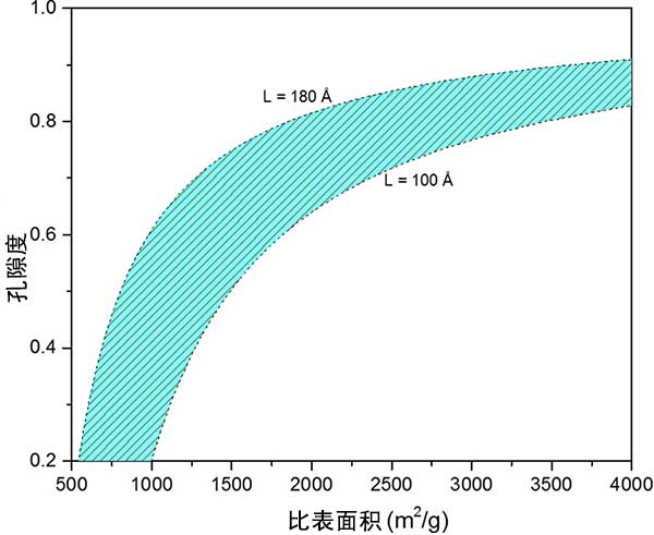 以前提出的活性炭微孔率模型將表面積和孔隙率作為兩個(gè)獨(dú)立變量處理。通過將石墨烯片的長度限制在100和180之間,并通過改變石墨中石墨烯層的平均數(shù)量,我們計(jì)算孔隙率和比表面積之間的關(guān)系。圖2顯示了孔隙率和表面積之間的關(guān)系。