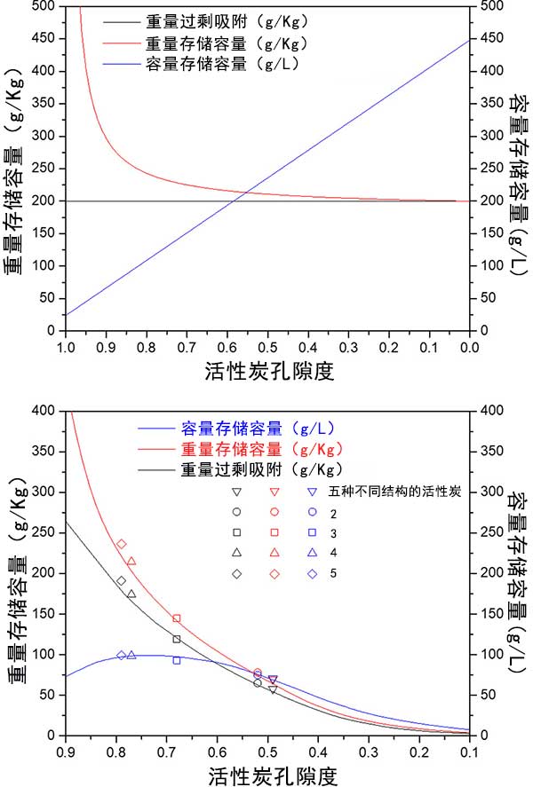圖4顯示了兩種活性炭的重量和體積存儲容量之間的相互依賴性。實(shí)驗(yàn)吸附測量與第二模型一致,將孔隙率和表面積作為因變量處理。經(jīng)過對比活性炭樣品的實(shí)驗(yàn)性過量吸附,重量儲存容量和體積儲存容量。圖3和圖4將理論模型與實(shí)驗(yàn)數(shù)據(jù)進(jìn)行比較。它表明,所開發(fā)的模型是通用的,并預(yù)測任何活性炭樣品的重量和體積儲存容量之間的相互依賴性。結(jié)果也適用于金屬有機(jī)骨架。雖然實(shí)驗(yàn)結(jié)果比較好的活性炭不具有較高的表面積,但孔隙率在0.65和0.75之間。通過使用化學(xué)粘合劑將活性炭粉末壓縮成整料,實(shí)現(xiàn)了更高的體積儲存容量。整體的體積儲存容量使用整體式整體密度而不是活性炭的表觀密度或金屬有機(jī)框架材料的單晶密度來計(jì)算。