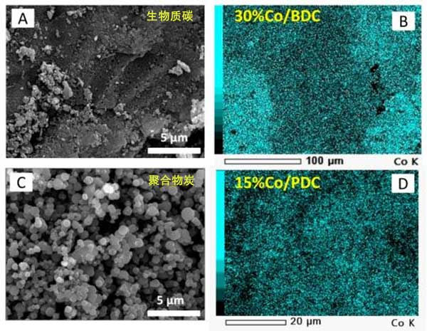 使用掃描電子顯微鏡(SEM)觀察由植物殼和酚醛樹(shù)脂的熱解獲得的活性炭的表面形態(tài),并分別在圖1A,C中示出?梢钥闯,不同的碳前體產(chǎn)生不同的表面形態(tài)。生物質(zhì)衍生的碳顯示出剛性和致密的結(jié)構(gòu),這是典型的木炭特征。而聚合物衍生的碳呈現(xiàn)具有粒子網(wǎng)絡(luò)的碳球,在球體之間產(chǎn)生大的空隙。然后將兩種活性炭用作氧化鈷的載體。為了觀察金屬氧化物在活性炭上的分散,進(jìn)行了SEM與能量色散X射線(EDX)的元素映射。圖1B,D表示裝載在兩種材料中的氧化鈷的代表。所有都顯示鈷材料(在青色中顯示)在活性炭中的均勻分散。這表明通過(guò)浸漬方法中描述的簡(jiǎn)單化學(xué)計(jì)量計(jì)算很好地實(shí)現(xiàn)了元素鈷的目標(biāo)負(fù)載。換句話說(shuō),上述結(jié)果清楚地顯示了制備氧化鈷活性炭的成功制備步驟。