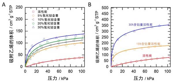 測(cè)試氧化鈷浸漬的活性炭的性能以進(jìn)行乙烯吸附。圖2A顯示在具有和不具有0-101kPa壓力范圍的氧化鈷活性炭中的乙烯吸附等溫線。吸附乙烯的體積定義為標(biāo)準(zhǔn)溫度和壓力下的體積。通常,可以看出乙烯吸收隨著壓力的增加而增加。大量乙烯吸附至40kPa壓力。當(dāng)將壓力增加到40kPa以上時(shí),所有樣品可以進(jìn)一步吸附少量乙烯(添加10%-25%)。氧化鈷浸漬的活性炭是無(wú)負(fù)載的活性炭?jī)杀兜囊蚁┪搅浚宄乇砻餮趸捲谠鰪?qiáng)活性炭對(duì)乙烯吸附方面效果比較好。增加氧化鈷的含量進(jìn)一步增加了乙烯在氧化鈷浸漬的活性炭上的吸附能力。當(dāng)使用30%氧化鈷時(shí)能達(dá)到較高吸附容量。
