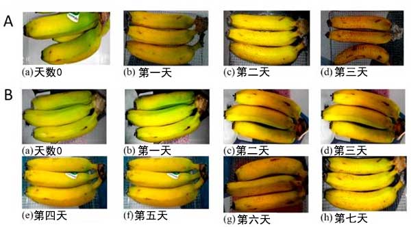 圖3A,B分別顯示了在沒(méi)有和使用氧化鈷浸漬的活性炭在封閉存儲(chǔ)期間的水果條件的日常記錄。使用活性炭15%氧化鈷材料,進(jìn)行半定量檢查(即顏色和棕色區(qū)域)。當(dāng)棕色主要出現(xiàn)時(shí),長(zhǎng)期保存時(shí)間被定義,并且香蕉從束中掉出來(lái)。當(dāng)將香蕉存放在沒(méi)有活性炭吸附劑的封閉盒子中時(shí),水果很快變得腐爛。僅在第三天,一束香蕉已經(jīng)從束中掉出來(lái)并出現(xiàn)棕色斑點(diǎn)。使用活性炭吸附劑情況下,可以清楚地看到水果保存時(shí)間的延長(zhǎng)。相對(duì)于沒(méi)有活性炭,顏色的變化被延遲(圖3B)。結(jié)果表明氧化鈷浸漬的活性炭作為乙烯清除劑在儲(chǔ)存系統(tǒng)中的效果,因此延長(zhǎng)了水果的儲(chǔ)存壽命。