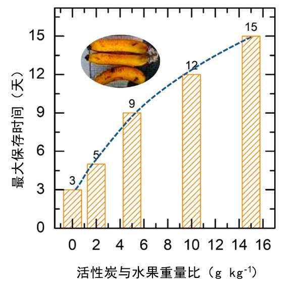 為了研究活性炭用量的影響,改變了活性炭和水果的質(zhì)量比。圖4顯示了活性炭與水果的保存時(shí)間與質(zhì)量比的范圍為。活性炭的量會(huì)影響保質(zhì)期,并且可以看到非線性相關(guān)性(見(jiàn)圖4中的虛線)。沒(méi)有活性炭達(dá)到存在,水果儲(chǔ)存時(shí)間僅為3天。根據(jù)添加的活性炭的質(zhì)量,保質(zhì)期可以從2天延長(zhǎng)至12天。通過(guò)添加15克吸附劑用于1千克水果,可以實(shí)現(xiàn)延長(zhǎng)高達(dá)5倍的保質(zhì)期。較高質(zhì)量的活性炭提供較長(zhǎng)的保存時(shí)間,這可能是由乙烯吸附的活性位點(diǎn)含量較高引起的。結(jié)果表明,氧化鈷浸漬的活性炭有望用于延長(zhǎng)水果的保質(zhì)期。