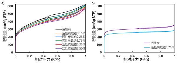 圖1:(a)化學(xué)活性炭在不同鋯負(fù)載之前和之后的-196℃下的氮吸附-解吸等溫線。(b)在鋯載荷為5.25%之前和之后的物理活性炭。