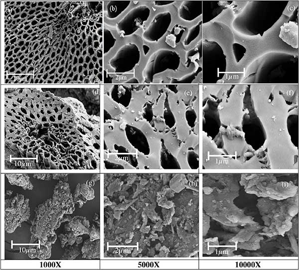 FESEM:三種活性炭在不同放大倍數(shù)下的顯微圖像顯示在圖3中?展钚蕴繕悠樊a(chǎn)生的蜂窩狀圖案孔隙網(wǎng)絡與優(yōu)化的碳納米管相似。油棕纖維活性炭上的孔也類似于空果束活性炭的蜂窩圖案。然而,與油棕纖維炭和棕櫚仁殼炭相比,空果束炭中的孔網(wǎng)絡更加突出和發(fā)展。棕櫚仁殼活性炭樣品顯示出很少的隧道孔,并含有阻塞毛孔的可見微塊。發(fā)達的多孔網(wǎng)絡表明可以沉積吸附物或離子的高表面積。