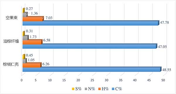 CHNS分析:在碳化和活化之前分析預處理活性炭的元素組成。圖4顯示了預處理樣品的定量元素分析的圖示。碳是所有樣品中最突出的元素,棕櫚仁殼,空果束和油棕纖維分別為48.55%,47.78%和47.05%?展7.03%的氫和1.36%的氮。油棕纖維含有6.58%的氫,1.73%的氮,而棕櫚仁殼含有6.26%的氫和1.05%的氮。對于所有活性炭樣品,硫含量不太重要,因為它們含量低于1%。