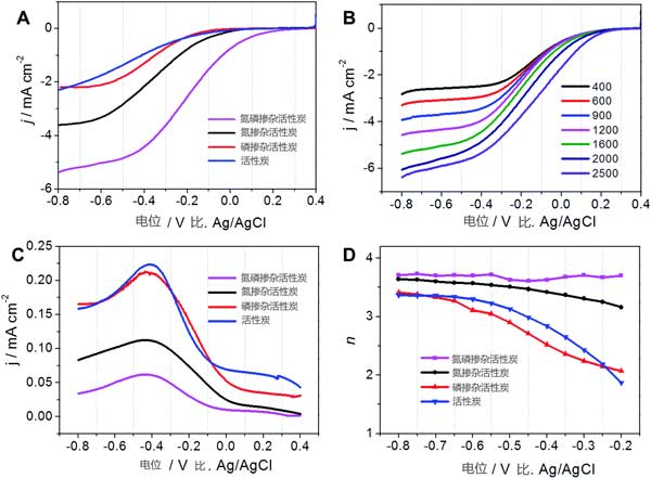 活性炭樣品通過兩步法制備,包括原位氧化聚合和高溫熱解。這里,苯胺和植酸分別用作氮源和磷源。為了研究氮磷碳比對活性炭的氧化還原電催化活性的影響,在中性介質(zhì)中進行循環(huán)伏安圖。旋轉(zhuǎn)圓盤電極伏安圖在氧飽和的50mM磷酸鹽緩沖溶液中進行,結(jié)果顯示在圖2A中。在摻雜碳改性后,活性炭基催化劑的起始電位顯示出從0V到+0.22V的大的正向偏移,氧化還原電流密度也大大增加。此外,由共摻雜碳改性的活性炭電催化活性優(yōu)于由單摻雜碳改性的活性炭電催化活性。在進行旋轉(zhuǎn)環(huán)盤電極測量以研究不同催化劑的過氧化氫的產(chǎn)生(圖2C)。正如預期的那樣,氮磷摻雜活性炭顯示出比其他催化劑更低的過氧化氫產(chǎn)生。可以看出,氮磷摻雜活性炭在氧化還原起始電位和高電流電流方面對氧化還原具有優(yōu)異的電催化活性,突出了N,P共摻雜和中孔結(jié)構(gòu)對氧化還原的重要性。