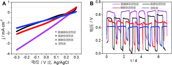 不同摻雜比的活性炭催化劑在微生物燃料電池中的實際性能,各種氧化還原催化劑的空氣陰極。線性掃描伏安法曲線由圖3A表明,所有的空氣陰極具有摻雜碳改性的活性炭催化劑表現(xiàn)出比原始活性炭催化劑的更高電流響應(yīng)。與氮摻雜和磷摻雜相比,氮磷共同摻雜的活性炭顯示高電流密度。如圖3B所示,使用雙摻雜的活性炭催化劑的空氣陰極燃料電池能夠在1000Ω的外部電阻上產(chǎn)生0.668V的穩(wěn)定電壓,這遠高于本期制造的其它催化劑。這些結(jié)果意味著摻雜碳的改性是增強活性炭的氧化還原活性的可靠方法。此外,當在微生物燃料電池的空氣陰極中用作氧化還原時,由氮和磷共摻雜碳改性制備的活性炭優(yōu)于氮磷單獨摻雜改性的活性炭。