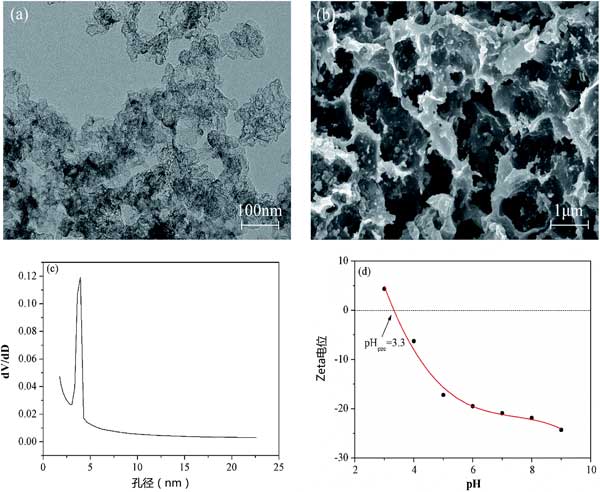 圖1:活性炭的SEM(a)和TEM(b)孔徑分布(c)pH(d)活性炭的zeta電位。