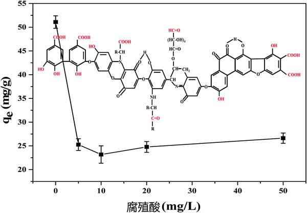 腐殖酸在通過死亡植物的微生物降解而衍生的天然水中普遍存在,其總是伴隨四溴雙酚A。因此,它的共存對四溴雙酚A的吸附效果是有影響的。根據(jù)四溴雙酚A在不同濃度腐殖酸下被活性炭吸附的結(jié)果(圖3),當腐殖酸濃度小于10mg L-1時,吸附容量顯著降低,而隨著腐殖酸濃度的持續(xù)增加,活性炭吸附四溴雙酚A增強。腐殖酸的基本結(jié)構(gòu)是芳香環(huán)和脂環(huán)環(huán),與羧基,羰基,醌基,羥基和甲氧基連接。所有這些結(jié)構(gòu)都可以形成π-π相互作用,與活性炭形成氫鍵,這可能是由于腐殖酸和四溴雙酚A在活性炭上的競爭性吸附,從而降低了四溴雙酚A的去除效率。高濃度腐殖酸吸附的輕微增加可能是由于游離四溴雙酚A吸附到吸附到活性炭表面的腐殖酸。
