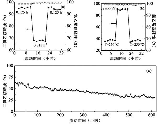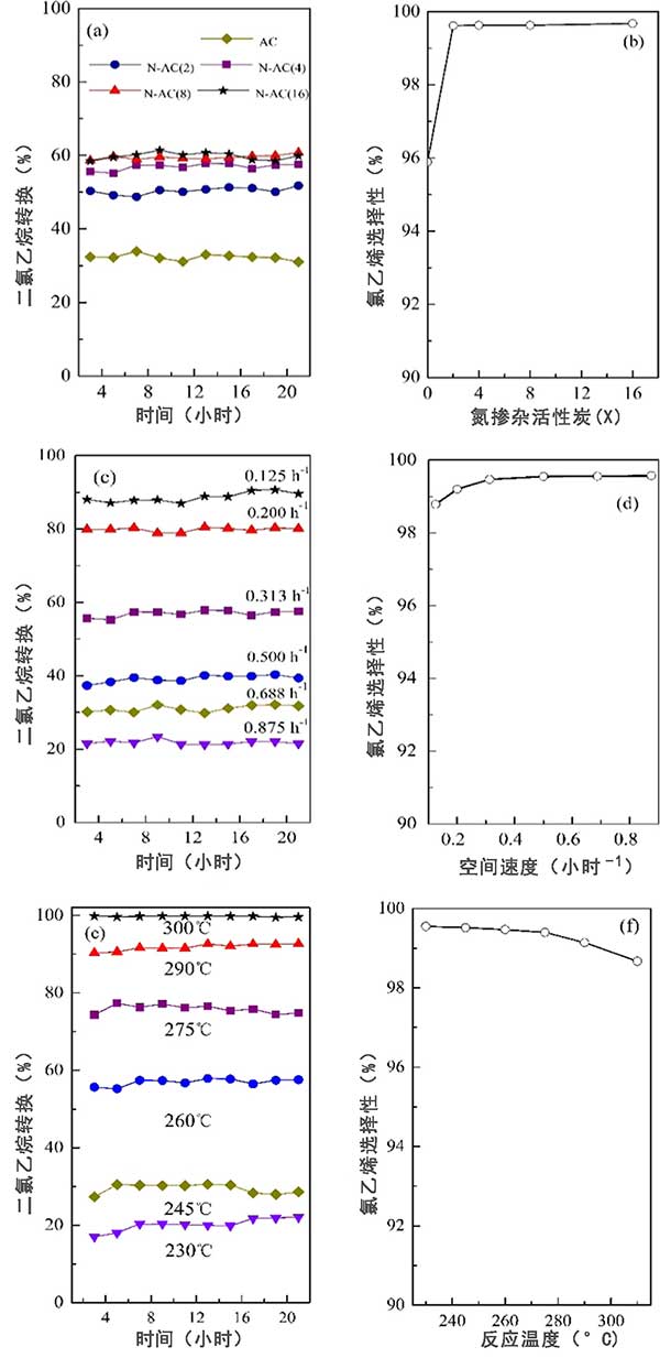 b、顯示出了反應溫度對氮摻雜活性炭中的二氯乙烷液時空速穩(wěn)定性的影響。氯乙烯選擇性在所有情況下都是相對靜態(tài)的,高于99%。