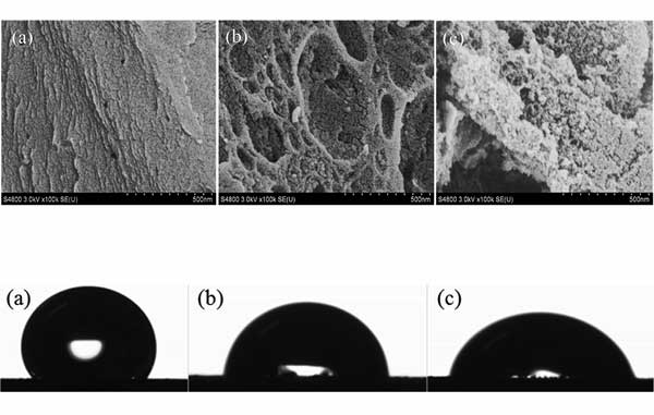 圖1中的FE-SEM圖像顯示活性炭和改性活性炭和二元混合物改性活性炭之間的不同形態(tài)。圖1a中活性炭的圖像顯示表面上的粗糙度和大孔,而改性活性炭在其表面上看起來(lái)光滑,帶有一層表面活性劑。此外,圖1c中的二元混合物改性活性炭樣品顯示出高度光滑的表面,并且表面層的飽和度高于圖1b中的改性活性炭樣品。所有這些觀察結(jié)果都暗示了表面活性劑和活性炭表面之間通過(guò)疏水相互作用。接觸角測(cè)量揭示了活性炭和改性活性炭的潤(rùn)濕行為,疏水性和親水性強(qiáng)度的變化。前進(jìn)和后退接觸角都表現(xiàn)出類似的表面潤(rùn)濕性趨勢(shì)。接觸角的值顯示了潤(rùn)濕性的順序二元混合物改性活性炭>改性活性炭>活性炭。二元混合物改性活性炭潤(rùn)濕性的高度改變可歸因于吐溫80具有高潤(rùn)濕能力。用季銨表面活性劑改性的活性炭酸鹽表面的潤(rùn)濕性發(fā)生了顯著變化。