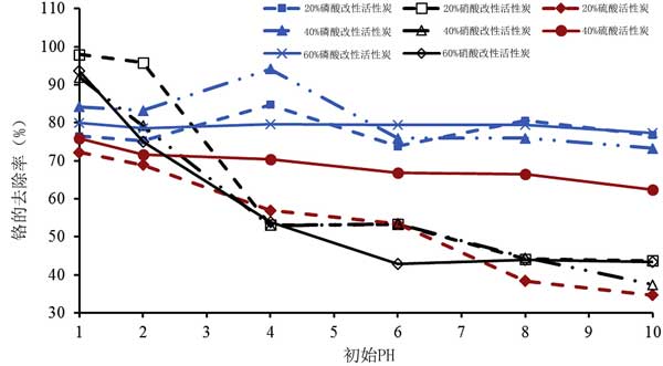 對鉻實現(xiàn)有效吸附所需的較高劑量可能意味著用硝酸,硫酸對活性炭進行化學氧化和磷酸除去吸附位點。具體地,當考慮所用的劑量和初始濃度時,硫酸和磷酸改性產(chǎn)生的活性炭與沒改性的相比具有較差的性能。因此,基于使用不同前體的研究,不能推廣酸改性對活性炭性能的影響。對于不同濃度硫酸磷酸改性和20%硝酸改性活性炭,在pH 1下各種吸附劑的處理能力都超過75%最大的硝酸改性活性炭達到了98%,而磷酸改性活性炭的那些性能最大?偟膩碚f,20%硝酸改性的活性炭才是去除鉻的最佳吸附劑。