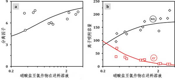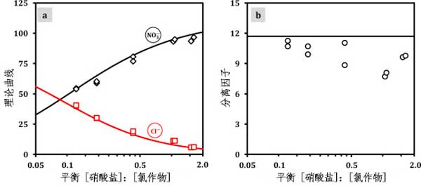 圖2a和圖2b顯示了平衡電吸附數(shù)據(jù)分離因子沒有和離子吸附容量作為的函數(shù)硝酸鹽至氯化物溶液中的濃度比。我們觀察到了平衡電吸附數(shù)據(jù)與離子吸附容量一起增加硝酸鹽至氯化物進(jìn)料溶液中的濃度比。在圖2b中,我們看到隨著初始增加硝酸鹽至氯化物氯-濃度比,濃度之差硝酸鹽和氯化物在微孔中增加。然而,在達(dá)到平衡之前,優(yōu)先離子電吸附由初始濃度比確定:溶液中具有最高濃度的離子主要是電吸附的。