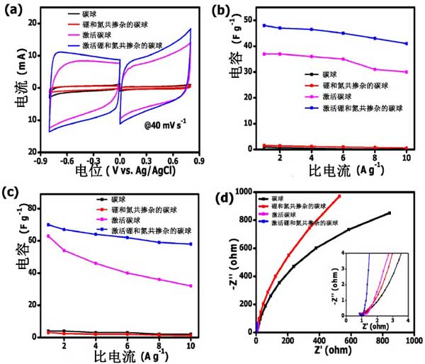 圖3顯示了在中性電解質(zhì)溶液3M KNO 3中,活性炭電極在正和負(fù)工作電位范圍內(nèi)的電化學(xué)分析結(jié)果。碳球和活性炭的相應(yīng)CV曲線呈現(xiàn)出準(zhǔn)矩形形狀,表示特征性的雙電層電容行為(圖3a)。正如預(yù)期的那樣,硼氮摻雜碳的CV曲線形狀比碳球的矩形更加矩形,因此顯示出較小的電阻碳表面。對(duì)碳球和硼氮摻雜碳觀察到的低電流響應(yīng)歸因于缺乏多孔結(jié)構(gòu),限制了電極和電解質(zhì)界面之間的離子擴(kuò)散和傳輸。相反,活性炭和硼氮摻雜活性炭的電流響應(yīng)由于在碳表面,然后促進(jìn)更好的電解質(zhì)-電極表面相互作用和增強(qiáng)的離子擴(kuò)散進(jìn)入孔隙較高。與未摻雜的碳球相比,硼氮摻雜活性炭由于其高表面積和硼氮和氧雜原子的存在而產(chǎn)生很高的電流響應(yīng)。