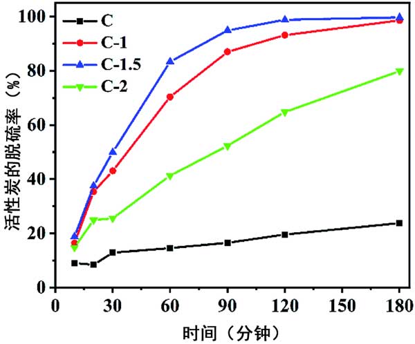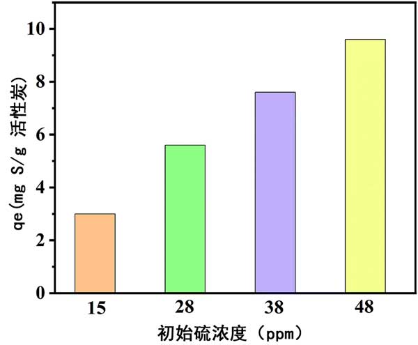基于以上結(jié)構(gòu)表征和實驗結(jié)果,得出了吸附機(jī)理。戊硫醇分子中的強(qiáng)路易斯酸S原子與活性炭中來自氧原子的一對電子相互作用。大孔和中孔的存在有助于活性炭的比表面積增加,暴露出更多的內(nèi)部原子,并促進(jìn)了質(zhì)量傳遞,從而使吸附劑易于與硫化物接觸。關(guān)于炭1.5的工業(yè)應(yīng)用前景,考慮了硫的初始濃度對吸附性能的影響。如圖3所示,對于初始含硫量分別為15、28、38和48 ppm的模型燃料,炭1.5的平衡吸附容量為每克吸附劑3.0、5.6、7.6和9.6 mgS。值得注意的是,在此濃度范圍內(nèi),吸附劑的硫去除率高于97%。這組結(jié)果表明該材料對于去除低濃度的硫化物具有明顯的工業(yè)應(yīng)用價值。