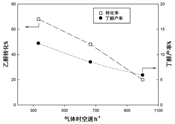 通過(guò)改變反應(yīng)器中的活性炭負(fù)載量,同時(shí)保持總流速和入口乙醇濃度不變,在400°C下初步研究了氣體時(shí)空速度對(duì)20%活性炭負(fù)載氧化鎂樣品的影響。結(jié)果以乙醇轉(zhuǎn)化率和丁醇產(chǎn)率報(bào)告于圖3。正如預(yù)期的那樣,乙醇轉(zhuǎn)化率通過(guò)降低氣體時(shí)空速度而增加。值得注意的是,對(duì)于較低的氣體時(shí)空速度值,制得丁醇的產(chǎn)率也增加。應(yīng)該注意的是,在我們的實(shí)驗(yàn)中負(fù)載的最大催化劑量(1克)對(duì)應(yīng)于約3厘米的催化床高度。更長(zhǎng)的催化劑床層將超過(guò)電爐的等溫區(qū),因此,未探索出較低的氣體時(shí)空速度值。另一方面,即使使用較大可能劑量的催化劑,在350°C下進(jìn)行測(cè)試所得到的丁醇產(chǎn)量也可忽略不計(jì)。