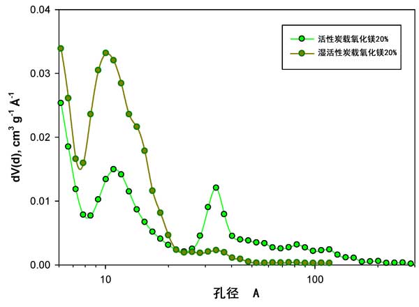初步的TG分析20%氧化鎂負(fù)載量的活性炭與釋放的氣體進(jìn)行IR分析表明,硝酸鹽的分解在400°C以下完成。在此溫度以上,僅發(fā)生了Mg(OH)2緩慢轉(zhuǎn)變?yōu)镸gO的情況。因此,所有在600°C下處理過(guò)的催化劑均由分散在活性炭上的MgO組成,而沒(méi)有硝酸鹽前體鹽的殘留。圖1報(bào)告了不同負(fù)載下的活性炭和負(fù)載了氧化鎂的活性炭催化劑的孔徑分布(PSD)。