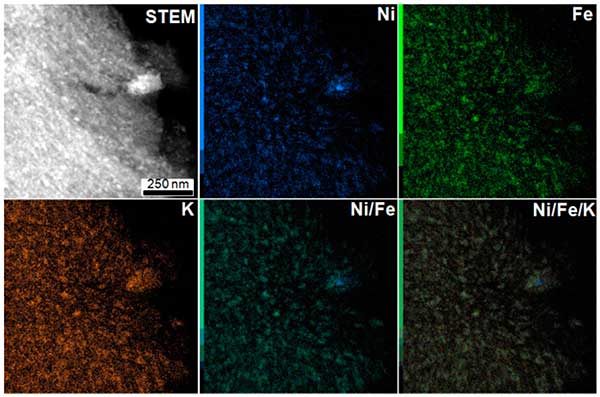 圖2:活性炭負(fù)載過渡金屬鎳材料的EDX圖譜,顯示了納米粒子中鎳,鐵和鉀的存在。
