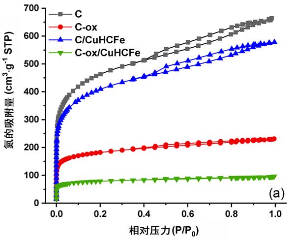 這些樣品的氮吸附等溫線和孔徑分布如圖3所示。。盡管活性炭和活性炭負(fù)載過渡金屬樣品的等溫線是I/IV型,結(jié)合了微孔和中孔性,但很難觀察到這些曲線的中孔部分,而活性炭負(fù)載過渡金屬樣品的等溫線幾乎消失了,說明了中孔性。該觀察結(jié)果與孔徑分布曲線一致,進(jìn)一步顯示了孔徑和尺寸的減小。另外,我們注意到,在兩種情況下,過渡金屬銅相的引入均導(dǎo)致窄的孔徑分布。這可能表明活性炭孔中存在一些顆粒。多孔性的降低和氧官能團(tuán)濃度的增加可能會(huì)影響銫的吸附性能。
