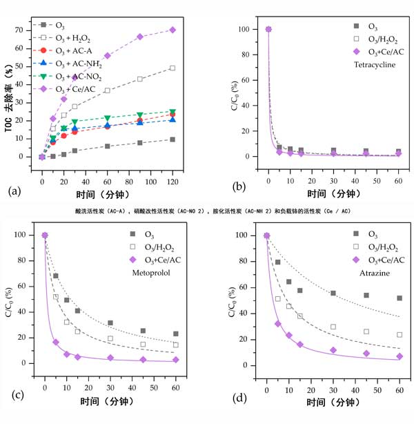由于其可用性和可靠性,反滲透工藝已廣泛應(yīng)用于城市廢水處理廠中的水再生利用;厥75-85%的給水時(shí),會(huì)同時(shí)產(chǎn)生反滲透濃縮液,其中含有高濃度的鹽和有機(jī)物。此外,還含有各種新興污染物,如果將反滲透濃縮液直接排放到水生環(huán)境中,,盡管這些有機(jī)物的濃度較低,也會(huì)會(huì)造成嚴(yán)重的環(huán)境危害。在本研究中,制備了酸洗活性炭,硝酸改性活性炭,胺化活性炭和負(fù)載鈰的活性炭。研究了這些活性炭在反滲透濃縮液中臭氧化有機(jī)化合物的性能。提出了一種可能的機(jī)制,用于水中有機(jī)化合物的催化臭氧氧化。