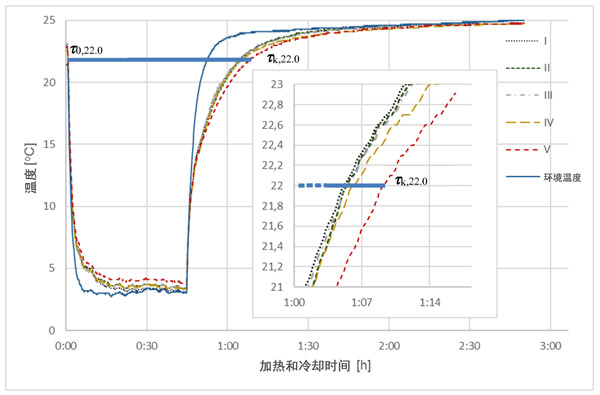 在分析曲線如圖2,圖3和圖4中,并收集結(jié)果,在一個(gè)溫度(22℃)中選擇,清楚地表明不同相變材料的影響活性炭中的量上的周期時(shí)間長(zhǎng)度與發(fā)生個(gè)體樣品中的熱交換過程。相對(duì)于溫度傳感器的更高的質(zhì)量和熱容量,即使吸附的相變材料的量很小,也可以看到處理時(shí)間的差異。當(dāng)與參比樣品(I),沒有相變材料,總的冷卻和加熱時(shí)間的所有樣品與相變材料的不同水平長(zhǎng)。對(duì)于樣品V,此時(shí)間延長(zhǎng)了7.5%,對(duì)于樣品IV,延長(zhǎng)了5.2%,對(duì)于III,延長(zhǎng)了2.4%,對(duì)于樣品II(未活化的活性炭),僅延長(zhǎng)了0.2%。