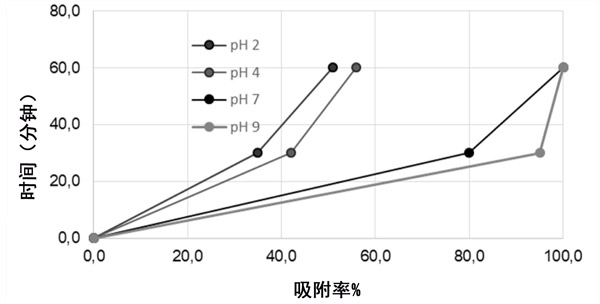研究了pH值對(duì)三甲胺在活性炭上吸附的影響。在該過(guò)程中,發(fā)生吸附現(xiàn)象的溶液的pH值是非常重要的參數(shù),尤其是在三甲胺為布朗斯臺(tái)德堿的情況下。在官能團(tuán)和吸附劑表面之間產(chǎn)生的靜電荷的大小主要取決于介質(zhì)的pH。在pH值為2、4、7和9的情況下,用0.200g的活性炭測(cè)量了在0、30和60分鐘時(shí)三甲胺的吸附百分比,結(jié)果總結(jié)在圖3中。