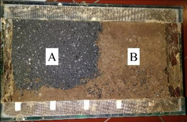 這項(xiàng)研究是在小型土壤上進(jìn)行的,然后將其注入含有重金屬的礦山廢料中。使用27.5厘米x10厘米x20厘米的水族箱制作土壤模型,每5厘米要釘一次。該釘塞提供了空間,并使重金屬廢物更容易吸收到土壤中。每天注入多達(dá)5毫升的重金屬廢物,直到其積累多達(dá)200毫升。然后將土壤模型分為兩個區(qū)域:區(qū)域A和區(qū)域B。區(qū)域A的表層土壤被施加了活性炭,而區(qū)域B被留下(圖2和圖3)。每天都用蒸餾水稀釋微型土壤,以保持土壤濕度。