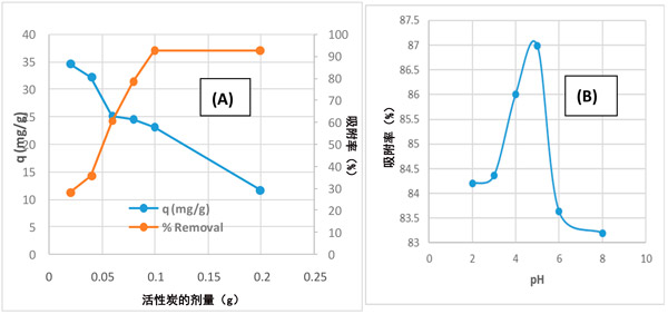 我們研究了不同參數(shù)對(duì)活性炭去除乙酰胺的影響,例如吸附劑的劑量,pH,乙酰胺的初始濃度和接觸時(shí)間。吸附劑的用量是吸附過程中的重要參數(shù),因?yàn)樗鼪Q定了系統(tǒng)中吸附劑與被吸附物的平衡以及給定濃度下吸附劑的容量。吸附劑劑量對(duì)由活性炭去除啶蟲脒的效果在不同的吸附劑的劑量從0.02-0.2克/100毫升變化進(jìn)行了研究,如圖1。隨著活性炭吸附劑劑量的增加,對(duì)乙酰胺的去除百分率從27.8%增加到92.5%。這可以歸因于活動(dòng)站點(diǎn)數(shù)量的增加。在較高的吸附劑量下,由于聚集體的形成,吸附位點(diǎn)的使用不完全。與去除百分率相反,隨著吸附劑劑量的增加,活性炭對(duì)乙酰胺的吸附能力下降了一些。注意到在0.1g的吸附劑劑量之后,吸附效率沒有顯示出顯著的增加,這表明了吸附位點(diǎn)的飽和。對(duì)于通過活性炭去除乙酰胺實(shí)驗(yàn)而言,0.1 g的吸附劑量似乎是合適的。